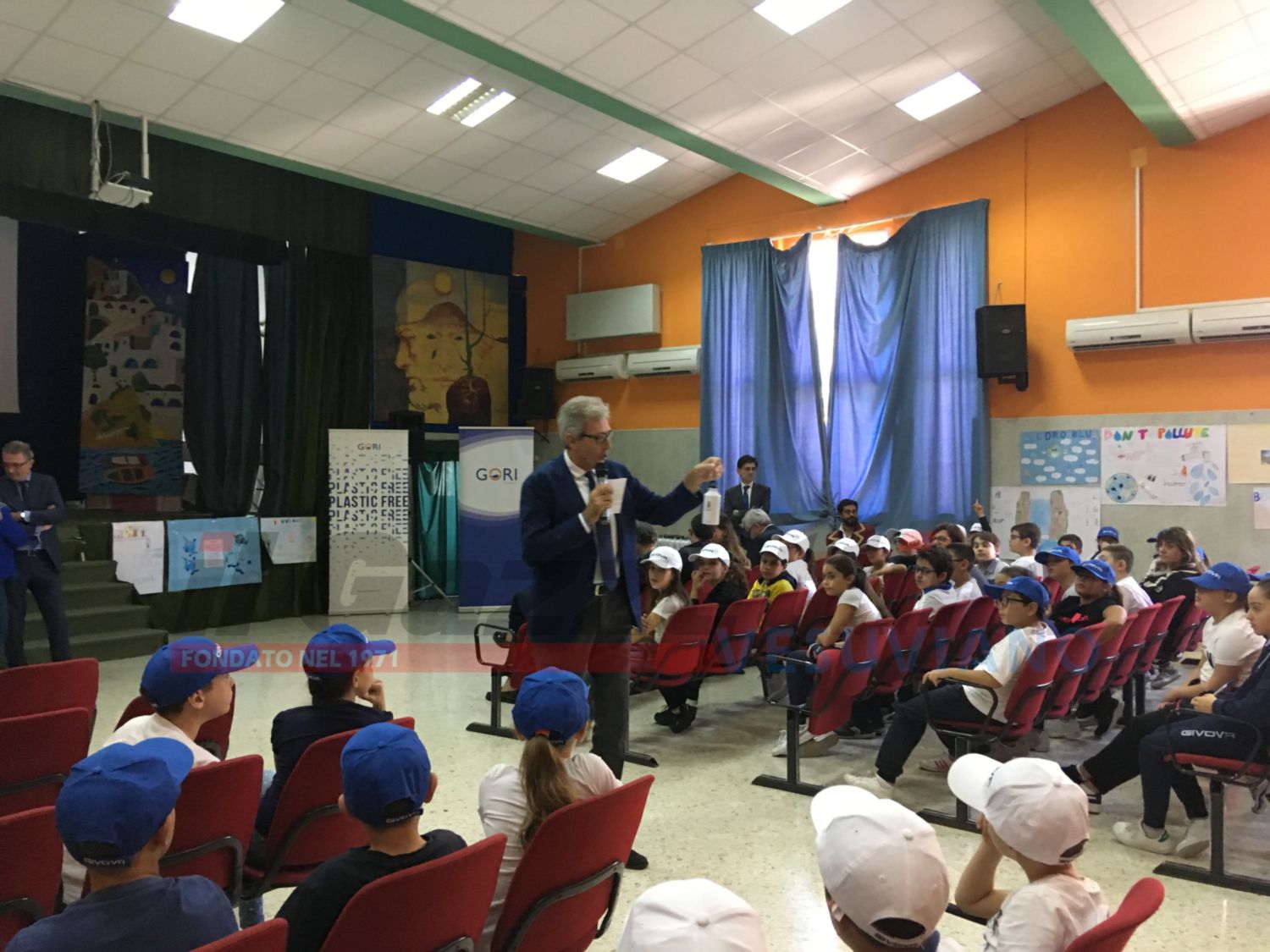 Le buone prassi arrivano a scuola sotto forma di una simpatica borraccina. Inizia così, nella sala teatro colorata da tantissimi disegni dei bambini, l’attività di GORI legata al #PlasticFree e, più in generale, alla tutela dell’ambiente. Dopo la firma apposta al manifesto d’intenti, con cui lo scorso giugno l’Azienda ha adottato i valori della campagna ministeriale contro la plastica monouso, questa mattina, presso il I Circolo Didattico “Luigi Leone”, sono state distribuite ai giovanissimi studenti le borraccine in alluminio da 400 ml, che sostituiranno le bottiglie di plastica. Saranno circa 4000, infatti, i gadget ecosostenibili destinati agli alunni delle scuole primarie di Pompei: un’importante iniziativa che si è sviluppata anche grazie alla proficua sinergia con l’amministrazione comunale, al fine di diffondere nei più piccoli la cultura della sostenibilità, avvicinandoli al consumo dell’acqua di rubinetto.