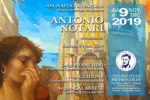 Sabato 9 Novembre 2019, alle ore 18:00, presso il Centro Studi Pietro Golia (Via Renovella 11, Napoli), si svolgerà l’inaugurazione della mostra d’arte intitolata “Da Napoli a Napoli”, dedicata ai sessanta anni di attività artistica del pittore e scultore Antonio Notari.