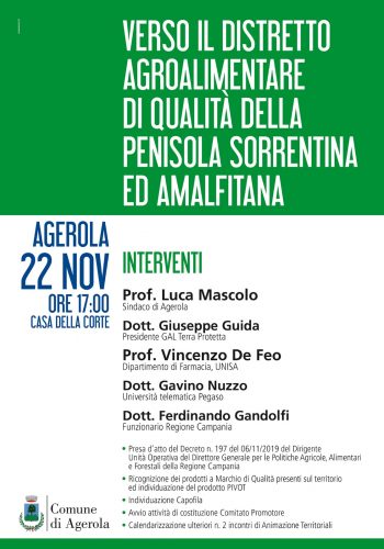 “Dare slancio allo sviluppo dei territori ed in particolare al comparto agroalimentare mediante il raccordo tra i soggetti pubblici e privati interessati che dovranno operare in modo integrato nel sistema produttivo locale”. Così Luca Mascolo, sindaco di Agerola.