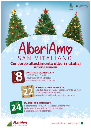 Gli addobbi di Natale potranno essere realizzati con qualsiasi tecnica e materiale, in forme classiche, moderne o astratte. La premiazione, avverrà martedì 24 dicembre, in Piazza Leonardo Da Vinci, nell’ambito di un evento animato da coinvolgenti spettacoli con artisti di strada. A latere del concorso è previsto anche, domenica 22 dicembre, sempre in Piazza Leonardo Da Vinci, il Villaggio di Babbo Natale, con animazione, spettacoli e giochi per i più piccoli. Il concorso, con tutte le attività ad esso collegate, vuole sensibilizzare la comunità sulle tematiche legate alla tutela dell’ambiente, aumentando la consapevolezza rispetto al valore della raccolta differenziata e al riuso degli oggetti. Un evento. imperdibile per far bene all’ambiente in occasione del Natale. Per informazioni: www.alberiamosanvitaliano.it.