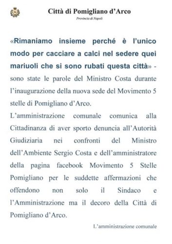 Dopo aver postato sul Blog delle Stelle di Pomigliano il discorso di Costa con relativo commento prontamente c’è stata la reazione del primo cittadino che in un comunicato alla cittadina, pubblicato sulla pagina istituzionale del comune ha dichiarato: “Il Sindaco di Pomigliano d’Arco a cospetto di tale infamante accusa che sa di menzogna pura e offende l’operato dell’ intera Amministrazione e il decoro della cittadinanza ha sporto denuncia-querela all’Autorità Giudiziaria nei confronti del Ministro Sergio Costa e del responsabile della pagina facebook del Movimento 5 Stelle Pomigliano che ha diffuso via social la videoripresa dell’esternazioni del Ministro”.
