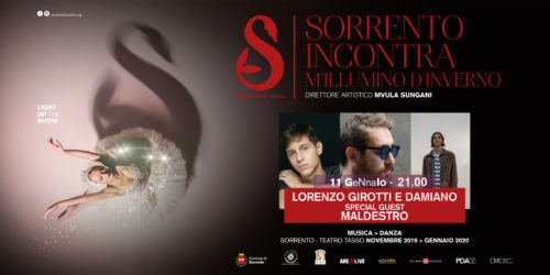 La rassegna multidisciplinare, che si avvale della direzione artistica del regista e coreografo Mvula Sungani, è promossa dal Comune di Sorrento, guidato dal sindaco Giuseppe Cuomo, in collaborazione con la Fondazione Sorrento, ed è organizzata da Arealive e CRDL, chiuderà il sipario 18 gennaio (ore 19) con quattro ospiti: Francesco Di Bella, accompagnato da Fofò Bruno, il rapper Cyrus e la cantante rumeno-partenopea BamBi.