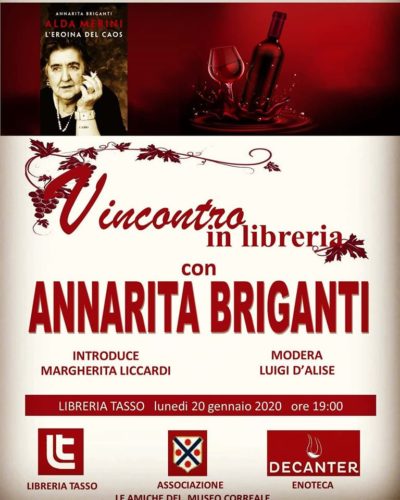 E’ Annarita Briganti la protagonista dell’incontro in programma lunedì 20 gennaio, alle ore 19, alla libreria Tasso, in piazza Angelina Lauro, a Sorrento. Intervistata dal giornalista Luigi D’Alise, la scrittrice presenterà il suo ultimo libro dal titolo “Alda Merini, l’eroina del caos”, una biografia della poetessa, anzi della poeta come amava definirsi, rock, ribelle, sopra le righe, contro ogni forma di convenzione e d’ipocrisia.