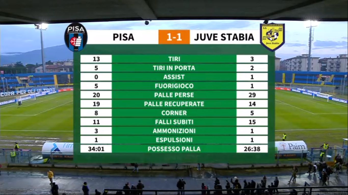 La Juve Stabia gestisce la gara nel finale della prima frazione che termina in parità dopo due minuti di recupero. Il Pisa ha costruito di più, con la traversa presa da Gucher come chance più propizia, Juve Stabia guardinga ma senza grosse ripartenze.
