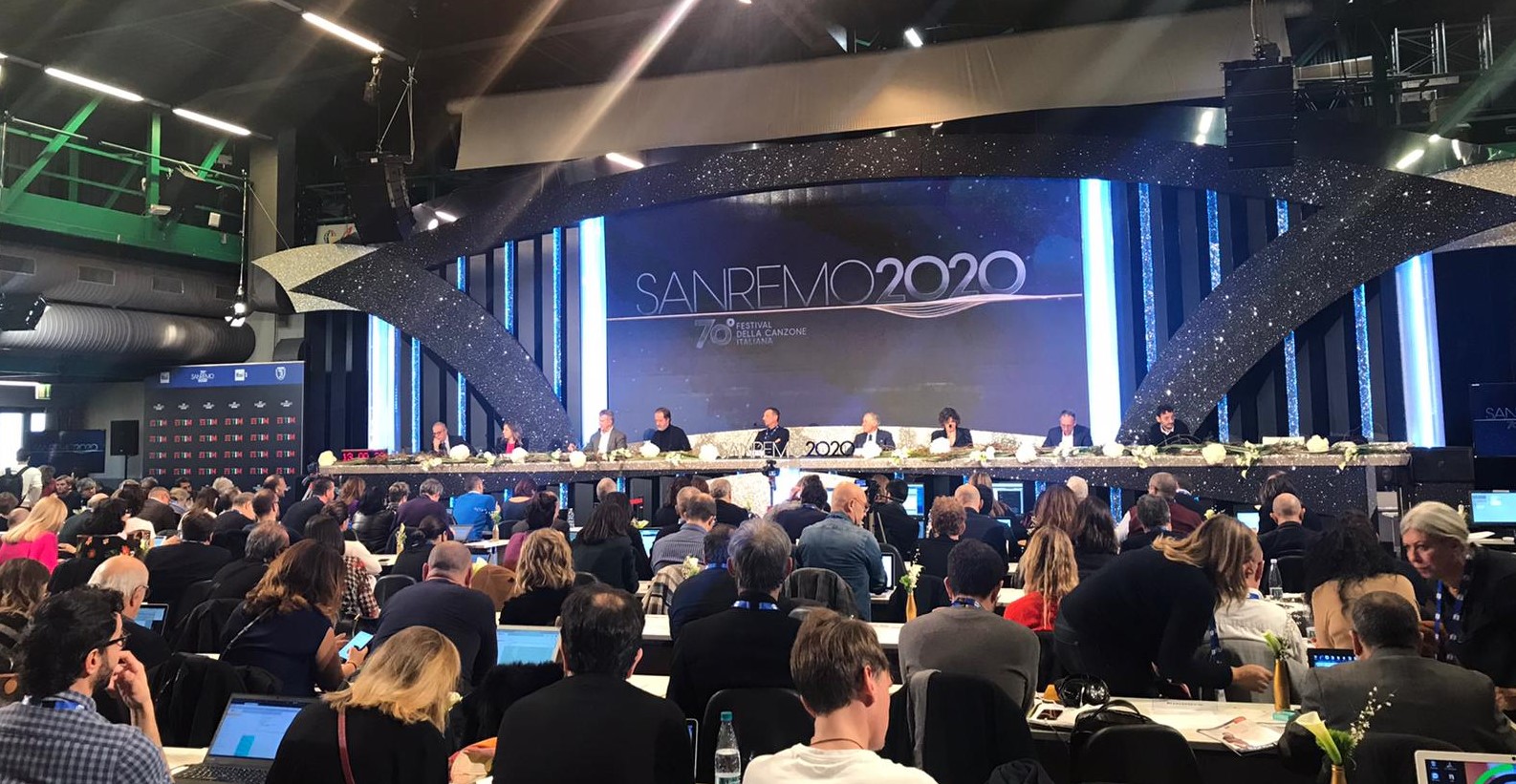 Sala stampa roof del Teatro Ariston gremita in attesa delle ultime novità. Insieme ad Amadeus al tavolo dei relatori anche i vertici Rai e le istituzioni.