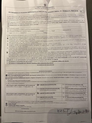 A commento della vicenda, Capasso ha scritto appunto il seguente post sul suo profilo social, allegando la foto del verbale recapitatogli dalle forze dell’ordine.