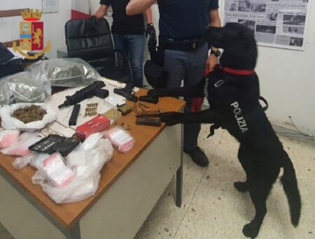 Durante l’attività i poliziotti hanno sequestrato in via Romolo e Remo, occultati nell’area verde di un complesso di palazzine, una pistola completa di 7 cartucce, una pistola mitragliatrice con 18 cartucce, tre buste contenenti 2 kg circa di marijuana, 93 cartucce di diverso calibro, due caricatori, un bilancino e diverso materiale per il confezionamento della droga.