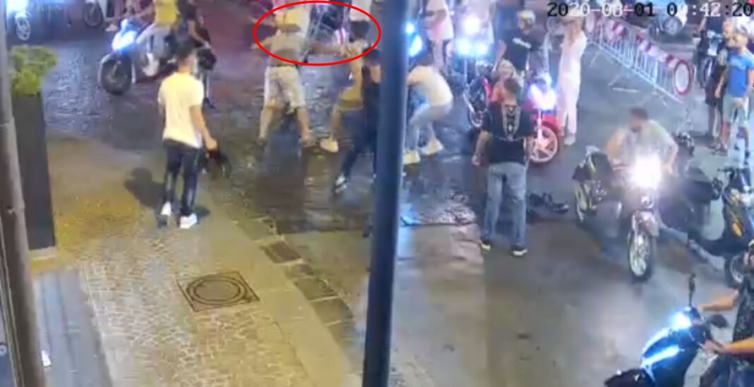 La ferocia del branco si è riversata sul giovane che è stato prima investito da uno scooter e poi picchiato con calci, pugni, sedie e colpi sulla testa assestati con i caschi delle moto. Un’escalation di violenza che si è conclusa con il lancio di un tavolino di alluminio dietro la nuca (cerchiato nella foto di apertura) del giovane che è svenuto.