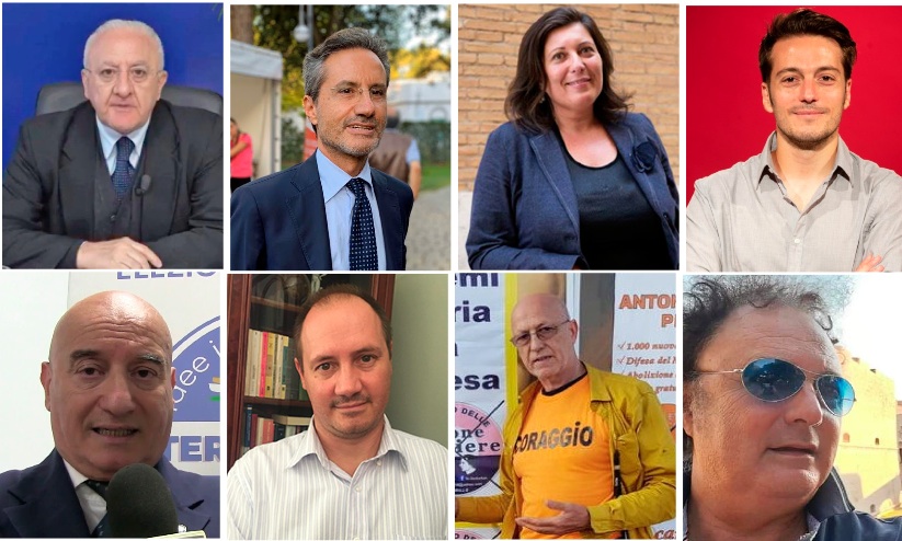 Sono otto i candidati alla presidenza della Giunta regionale della Campania. A sfidare l’uscente Vincenzo De Luca (sostenuto da 15 liste) ci saranno Stefano Caldoro, candidato del centrodestra e già presidente della Regione Campania dal 2010 al 2015, Valeria Ciarambino del M5s, il candidato di Potere al Popolo, Giuliano Granato; del Terzo Polo, Sergio Angrisano; di Terra, Luca Saltalamacchia, della lista Naturalismo, Giovanni Nappi e del partito delle Buone Maniere, Giusepe Cirillo.