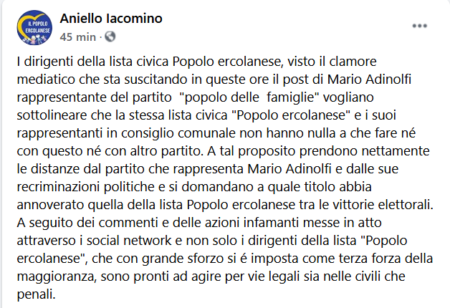 Tanto da spingere, come già raccontato, i vertici della lista civica a dover effettuare una pubblica e secca smentita. Non solo, minacciando perfino azioni legali come lo stesso Iacomino annuncia a nome del gruppo locale: «A tal proposito prendono nettamente le distanze dal partito che rappresenta Mario Adinolfi e dalle sue recriminazioni politiche e si domandano a quale titolo abbia annoverato quella della lista Popolo ercolanese tra le vittorie elettorali. A seguito dei commenti e delle azioni infamanti messe in atto attraverso i social network e non solo i dirigenti della lista “Popolo ercolanese”, che con grande sforzo si é imposta come terza forza della maggioranza, sono pronti ad agire per vie legali sia nelle civili che penali».