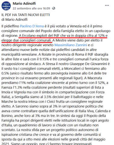 Il “post” a cui si riferisce, e che ha scatenato le proprie ire, è quello del Segretario nazionale de “Il Popolo della Famiglia” il quale si è intestato la paternità del simbolo sceso in campo nella competizione elettorale conclusasi da pochi giorni, e quindi del successivo risultato vincente.