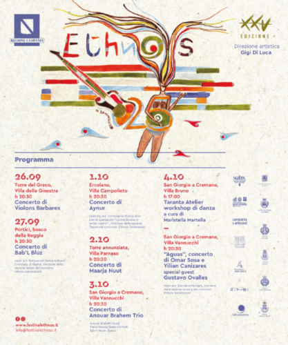 «25 anni di concerti, 25 anni di incontri e confronti musicali e culturali. 25 edizioni di un festival che ha aperto lo sguardo del territorio vesuviano e napoletano sul resto del mondo, accogliendo da ogni dove artisti noti e nuove realtà, che hanno lasciato un segno in generazioni di spettatori. Un seme, che noi coltiviamo sin dalla prima edizione, per una società più aperta e multiculturale dove le differenze sono una ricchezza da preservare» dichiara il direttore artistico Gigi Di Luca. «Il festival Ethnos ritorna dove è nato nel 1995, nel Miglio d’oro, una scelta simbolica e importante per ripartire con lo stesso entusiasmo di allora, per guardare avanti in un momento così difficile, in cui ogni sera che un artista va in scena si compie un piccolo miracolo».