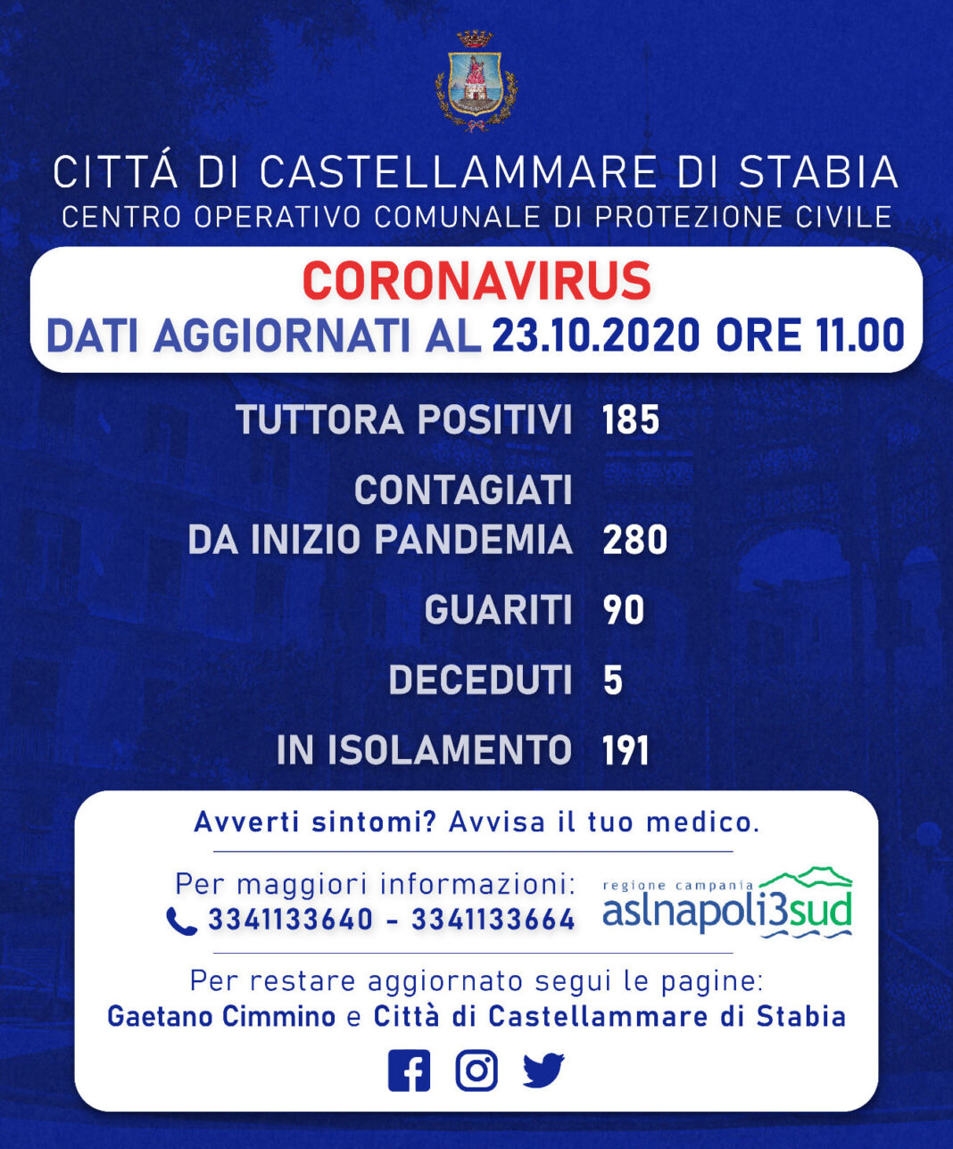 In linea con l’incremento complessivo dei contagi nella Regione Campania, il computo totale della città stabiese si è aggiornato nuovamente in un’importante crescita: su un totale di 280 contagiati da inizio pandemia, sono 90 i guariti, 5 i deceduti e ben 185 i tuttora positivi. Sono disposti in regime di quarantena, invece, 191 cittadini stabiesi.