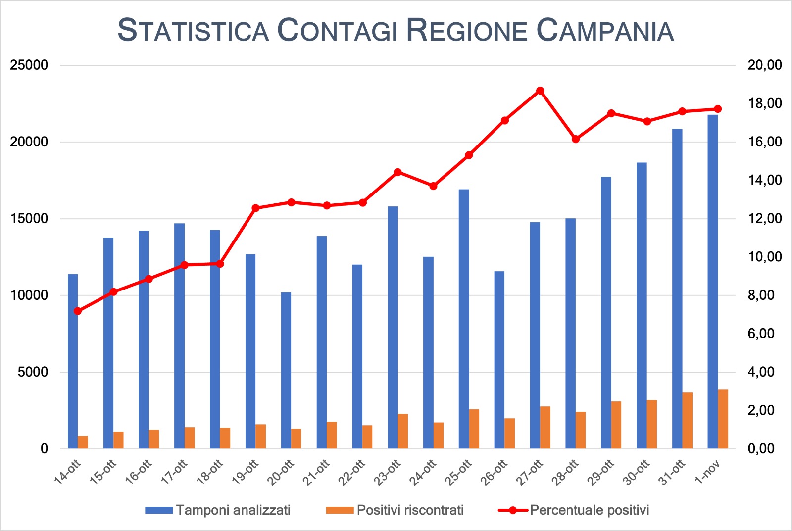 Sempre più tamponi processati in Campania oggi sono riportati i risultati di 21.785 in riferimento alla giornata di ieri, sabato 31 ottobre. Aumento di conseguenza anche i positivi riscontrati, che oggi segnano un altro picco con 3.860 in regione.