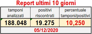 Negli ultimi 10 giorni sono state rilevate 19.275 persone positive, su 188.048 tamponi analizzati.