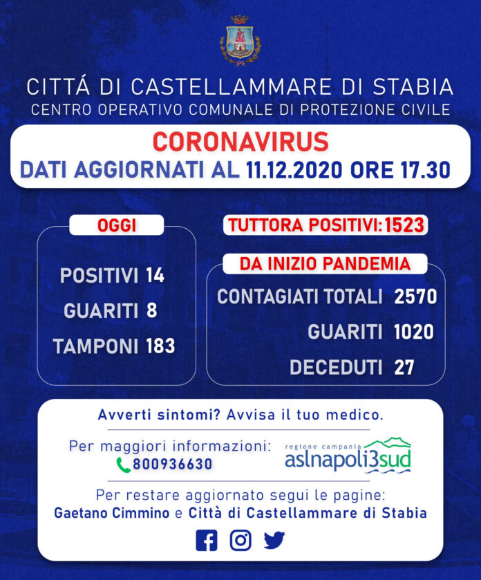 La Regione Campania e l’Asl Na 3 Sud ci hanno comunicato poco fa che su 183 tamponi sono 14 i cittadini di Castellammare di Stabia risultati positivi al coronavirus (Covid-19) nelle ultime 24 ore. Solamente 6 di essi risultano avere sintomi lievi della malattia.