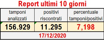 Nel report degli ultimi 10 giorni si registrano 11.295 persone positive, su 156.143 tamponi analizzati.
