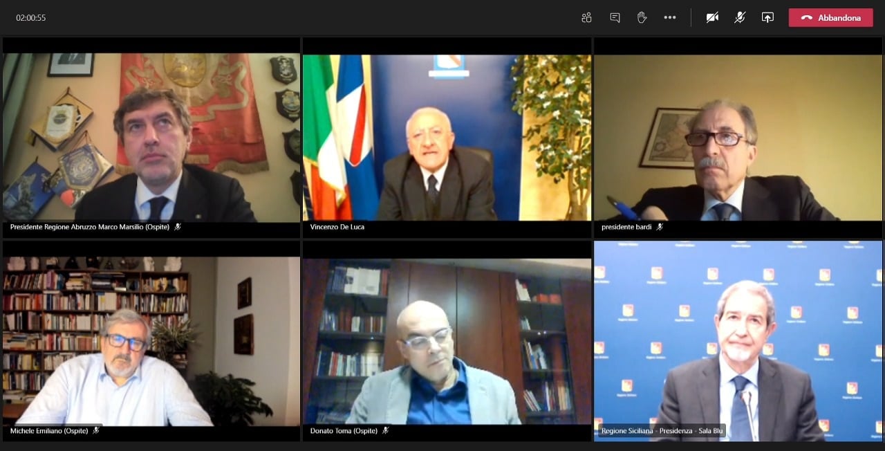 Alla riunione hanno partecipato i Presidenti della Campania Vincenzo De Luca, dell’Abruzzo Marco Marsilio, della Basilicata Vito Bardi, del Molise Donato Toma, della Puglia Michele Emiliano, della Sicilia Nello Musumeci. Non hanno potuto partecipare, per concomitanti impegni istituzionali, i Presidenti della Sardegna Christian Solinas e della Calabria Nino Spirlì.