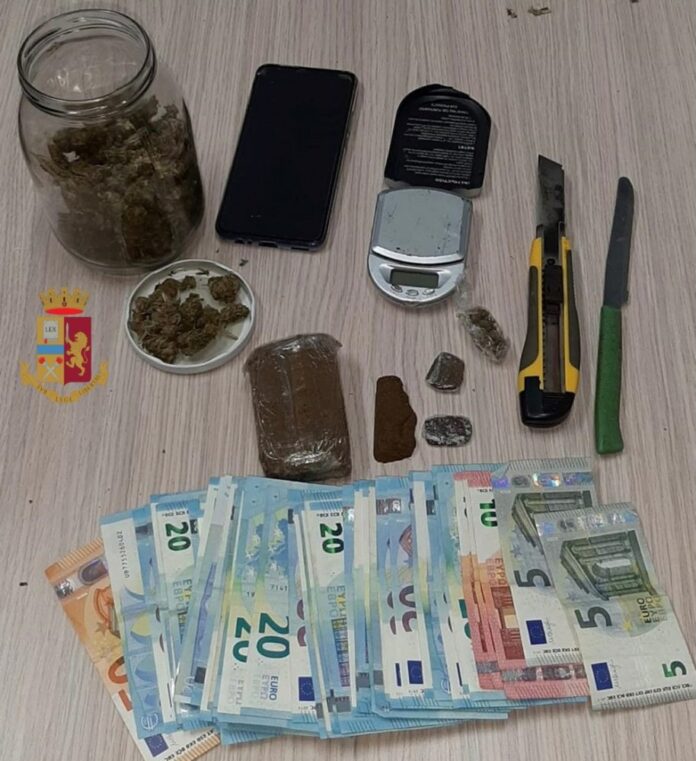 Gli agenti hanno raggiunto e bloccato lo spacciatore trovandolo in possesso di due involucri contenenti marijuana e hashish, mentre nella sua abitazione hanno rinvenuto un barattolo con 50 grammi circa di marijuana, un panetto di hashish di 110 grammi circa, 950 euro, un bilancino e diverso materiale per il confezionamento della droga.