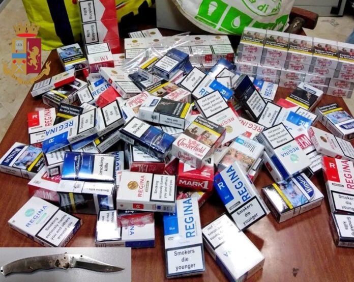I poliziotti lo hanno bloccato trovandolo in possesso di un coltello a serramanico e di 130 pacchetti di tabacchi lavorati esteri, privi del marchio del Monopolio di Stato, per un peso complessivo di circa 2,6 kg.