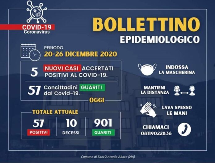 Registrati 5 cittadini positivi al Covid-19 e ben 57 casi di accertata guarigione nel Comune di Sant’Antonio Abate. Questi i dati diramati dai vertici dall’Asl Na 3 per quanto riguarda il periodo dal 20 al 26 dicembre.