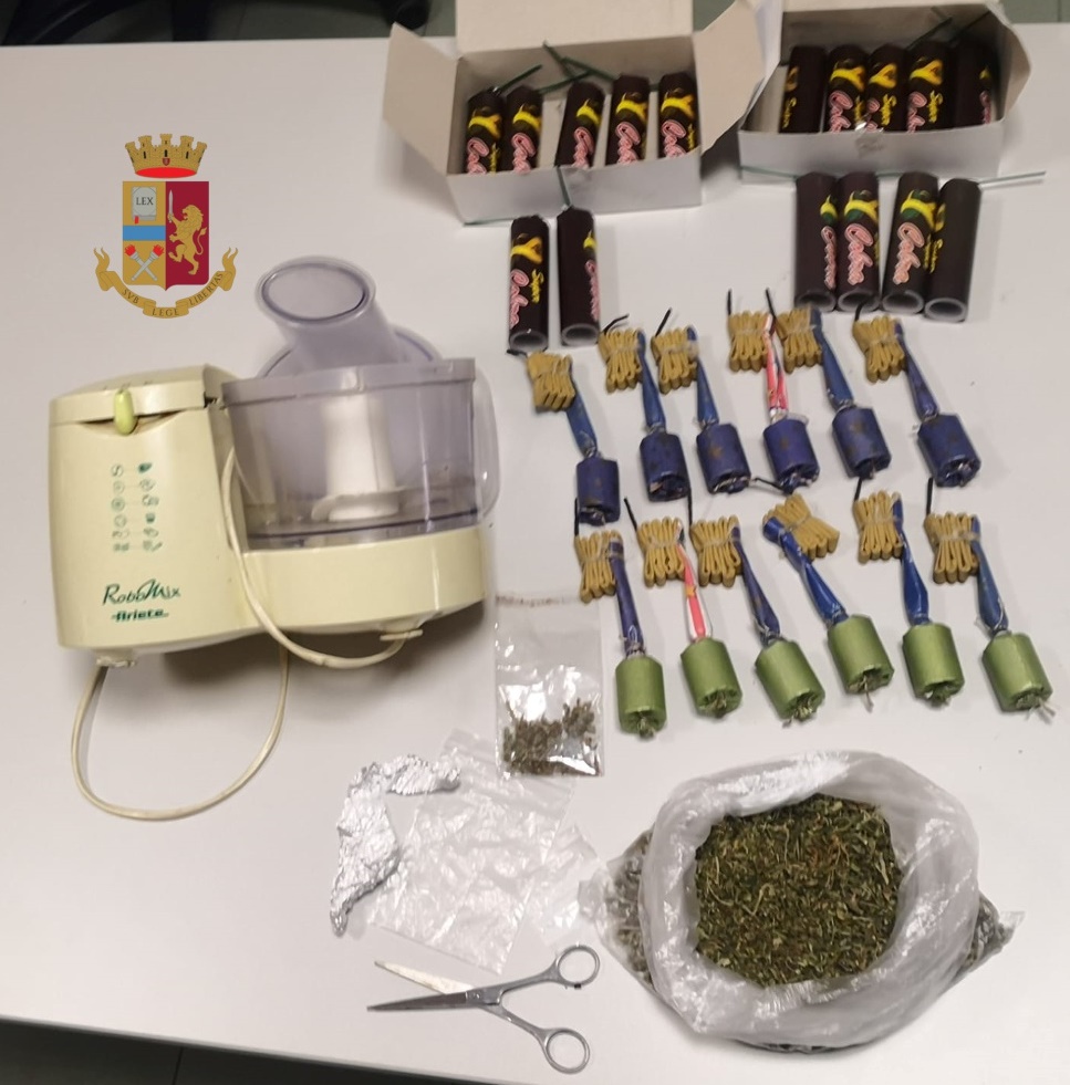 Nella casa hanno rinvenuto, nascosta in un deposito, una busta contenente 58 grammi circa di marijuana, materiale per il confezionamento della droga, 12 botti pirotecnici artigianali e 16 petardi “super cobra” illegali poiché privi della classificazione.