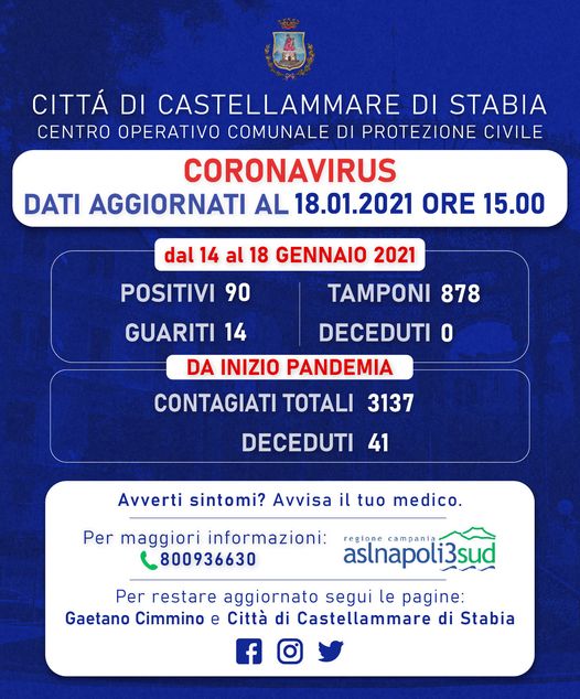 “La Regione Campania e l’Asl Na 3 Sud ci hanno comunicato che sono 90 i cittadini di Castellammare di Stabia risultati positivi al coronavirus (Covid-19) nel periodo dal 14 al 18 gennaio 2021. 42 di essi presentano sintomi lievi della malattia”. Così il sindaco di Castellammare di Stabia Gaetano Cimmino.
