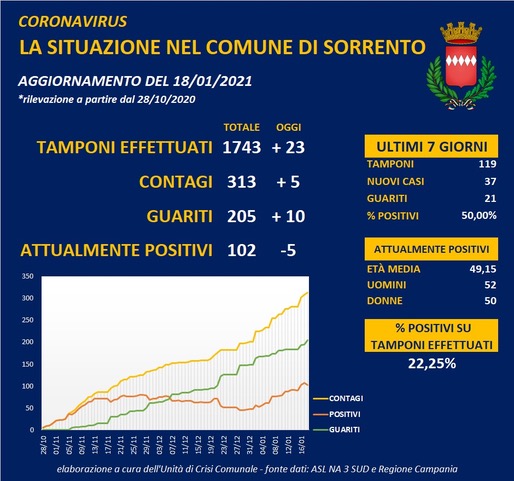La notizia che rassicura la città di Sorrento è l’aumento di 10 nuovi guariti che vede il numero restare a 205 unità.