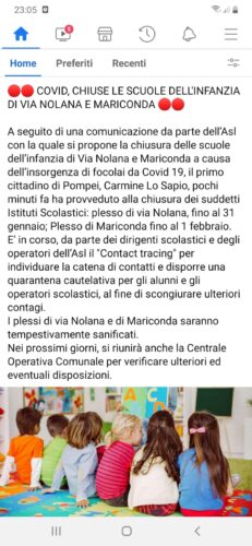 Questo quadro di tanto atteso “ritorno alla normalità” è stato sconvolto in serata dalla comunicazione del dirigente scolastico del Secondo Circolo Didattico di Pompei, prof.ssa Anna Maria Cioffi: “Sospensione attività didattiche plesso via Nolana” Scuola dell’Infanzia.