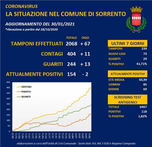 Undici cittadini positivi al tampone. L’Unità di crisi del Comune di Sorrento ha reso noto i dati di oggi, 30 gennaio. Gli attualmente positivi sono 154.