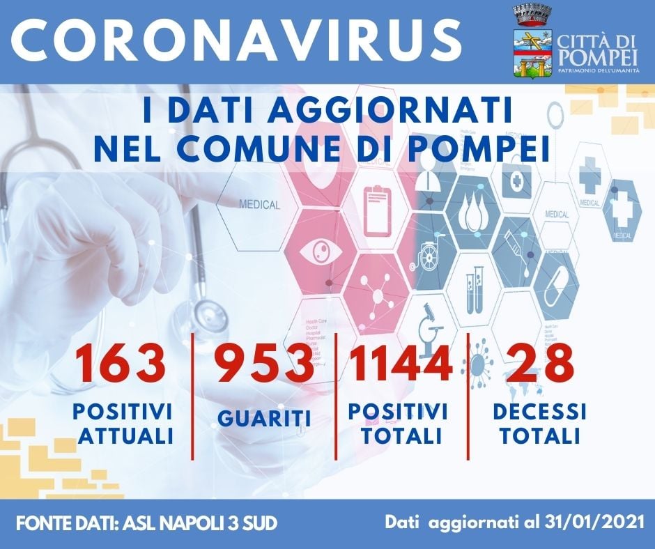 Pubblicato il report Covid del 31 gennaio per la città di Pompei. La situazione dei contagi mostra ulteriori positivi e fortunatamente nessun nuovo deceduto.
