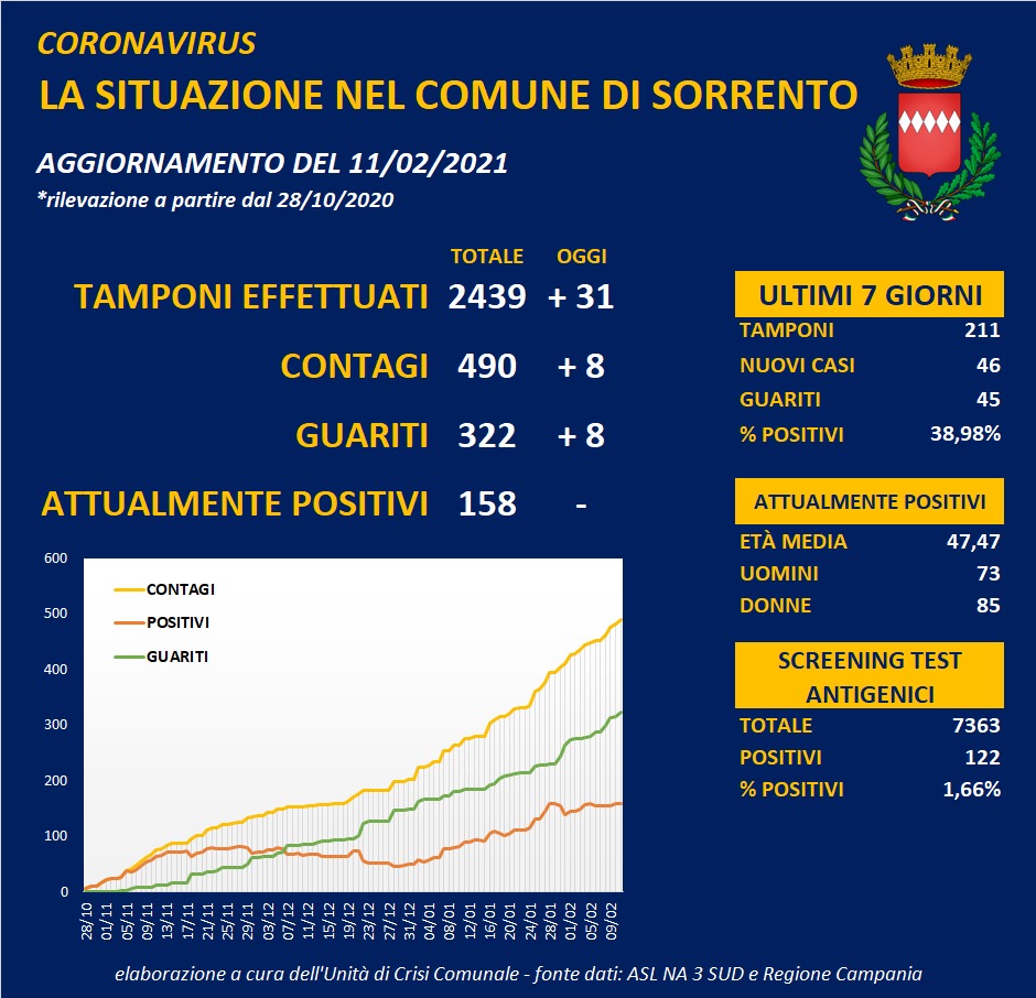 Otto cittadini positivi al tampone. L’Unità di crisi del Comune di Sorrento ha reso noto i dati di oggi, 11 febbraio. Gli attualmente positivi restano 158.