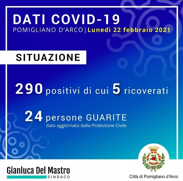 Risale al giorno 22 febbraio l’ultimo bollettino aggiornato del Centro Operativo Comunale diramato durante una diretta social dal sindaco Gianluca Del Mastro. I contagi da Covid-19 sul territorio pomiglianese sono in forte crescita, il numero dei positivi è cresciuto in maniera esponenziale in soli quattro giorni, dal 19 febbraio i contagiati da Sars-Cov2 da 258 sono saliti a 290 di cui 5 ricoverati mentre sale a 24 il numero dei guariti.