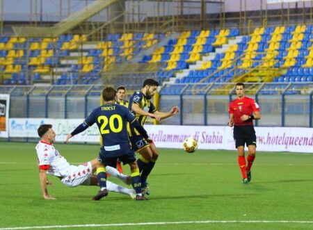 Gli stabiesi infatti centrano un palo al 31′ su conclusione di Vallocchia da fuori area. In precedenza i locali avevano pure reclamato un penalty per un presunto fallo di mano in area di un difensore. Il pericolo scuote il Bari che con Marras trova la giocata risolutiva in area gialloblù per l’1-0. Evidente in questo frangente la maggior reattività dell’attacco degli ospiti.