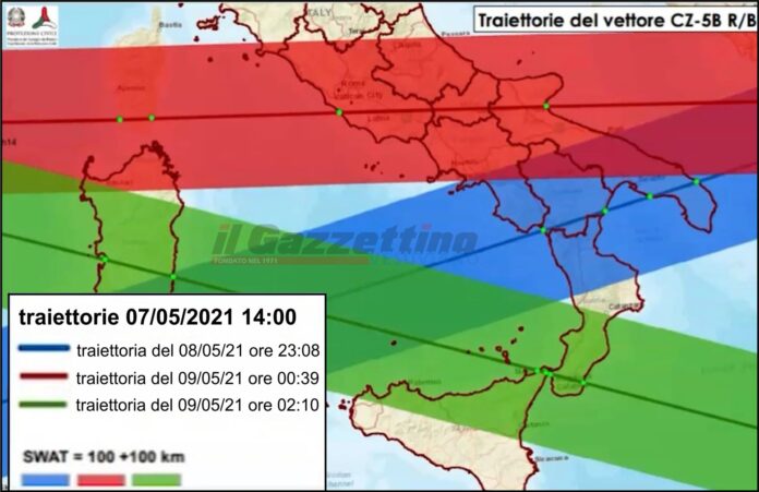“Su informativa dell’ASI, Agenzia Spaziale Italiana, si prende atto che nella notte tra sabato 8 e domenica 9 maggio p.v. all’interno della fascia di dispersione che ricomprende anche il territorio nazionale delle regioni Lazio, Abruzzo, Molise, Campania, Basilicata, Puglia, Calabria, Sicilia e Sardegna, è previsto il rientro incontrollato in atmosfera del secondo stadio del vettore PRC CZ5B che potrebbe interessare il settore centro-meridionale del territorio nazionale. Si ricorda che eventi di questo tipo e casi reali di impatto sulla Terra, ed in particolare sulla terraferma, sono assai rari e pertanto non esistono comportamenti di autotutela codificati in ambito internazionale da adottare a fronte di questa tipologia di eventi.