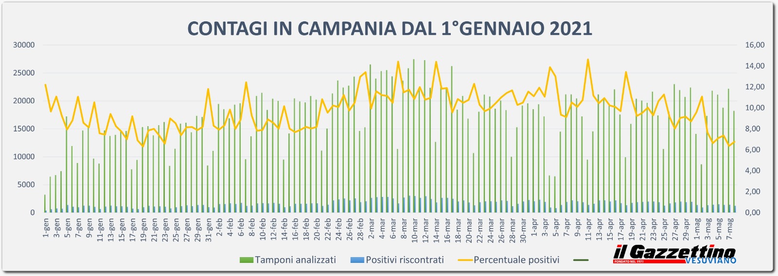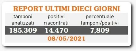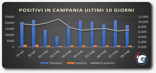 Stabile il tasso di positività in Campania dove la percentuale sale di appena qualche decimo di punto in riferimento ai tamponi processati nella giornata di sabato 8 maggio. I decessi oggi sono in netto calo.