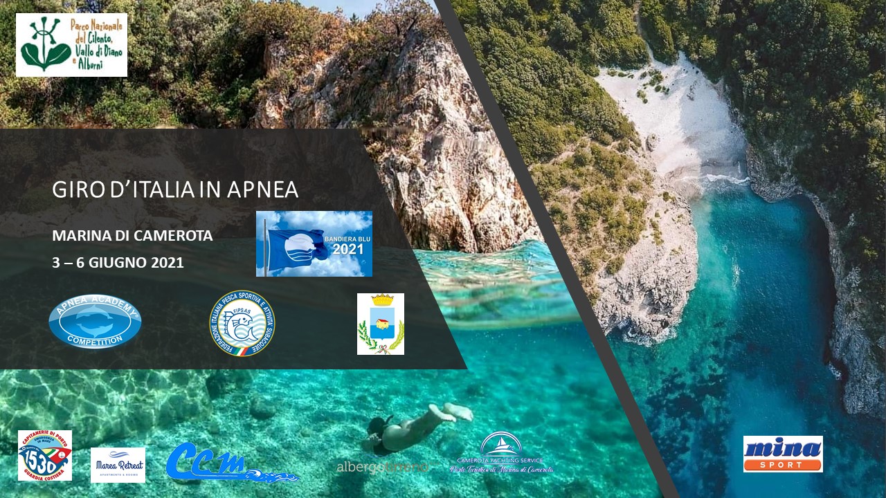Il “Giro d’Italia in Apnea – Trofeo di Camerota” è organizzato da Apnea Academy Competition, l’associazione sportiva collegata alla scuola Apnea Academy di Umberto Pelizzari, con il patrocino morale del Comune di Camerota, il sostegno dell’Ente Parco del Cilento, Vallo di Diano e Alburni, della Cooperativa Cilento Mare, del Marina Camerota Yachting Service, di Marea Retreat ed Albergo Tirreno. Gli sponsor di tutto il Giro d’Italia in Apnea sono Mina Sport, Mare di Carta e Hand.