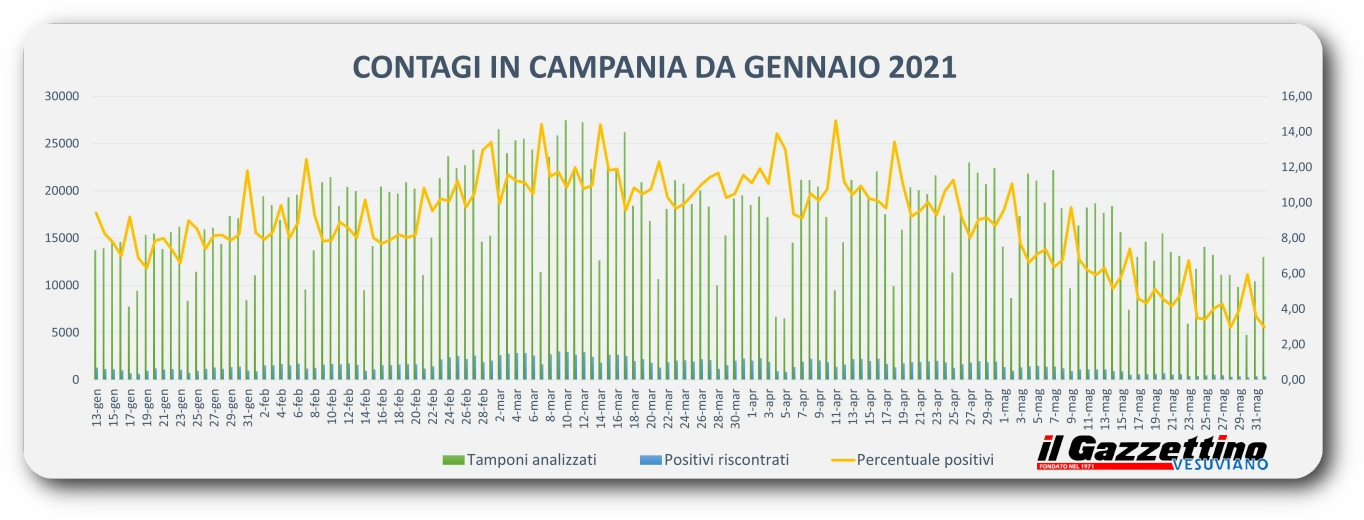 Il totale dei positivi è di 420.032, da inizio pandemia in Campania, mentre il totale dei tamponi eseguiti è arrivato a 4.953.254.