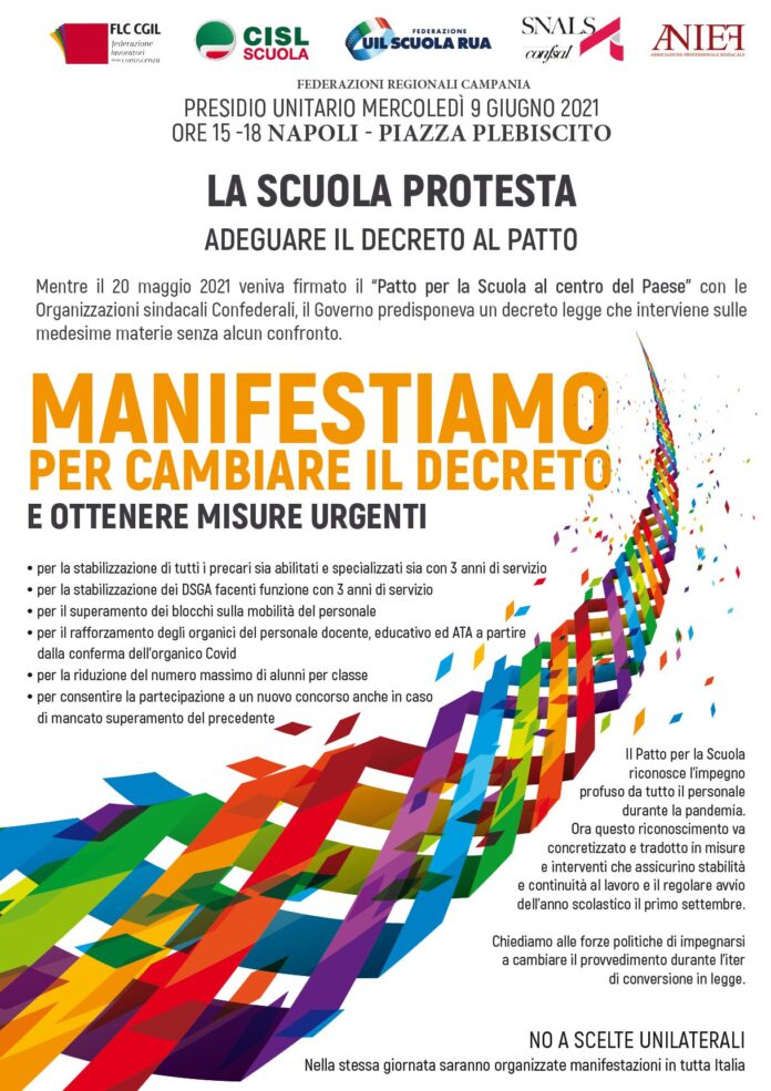 La protesta è annunciata per il 9 giugno. Anief insieme a tutti i sindacati principali della scuola da Cgil, Cisl, Uil, a Snals scenderanno a Napoli in piazza del Plebiscito alle ore 15 alle 18 chiedendo al governo di modificare le misure contenute nel DL Sostegni bis. Questa manifestazione è l’eco campano alla manifestazione nazionale indetta dalle stesse OOSS nello stesso giorno e ora a Roma davanti a Montecitorio.