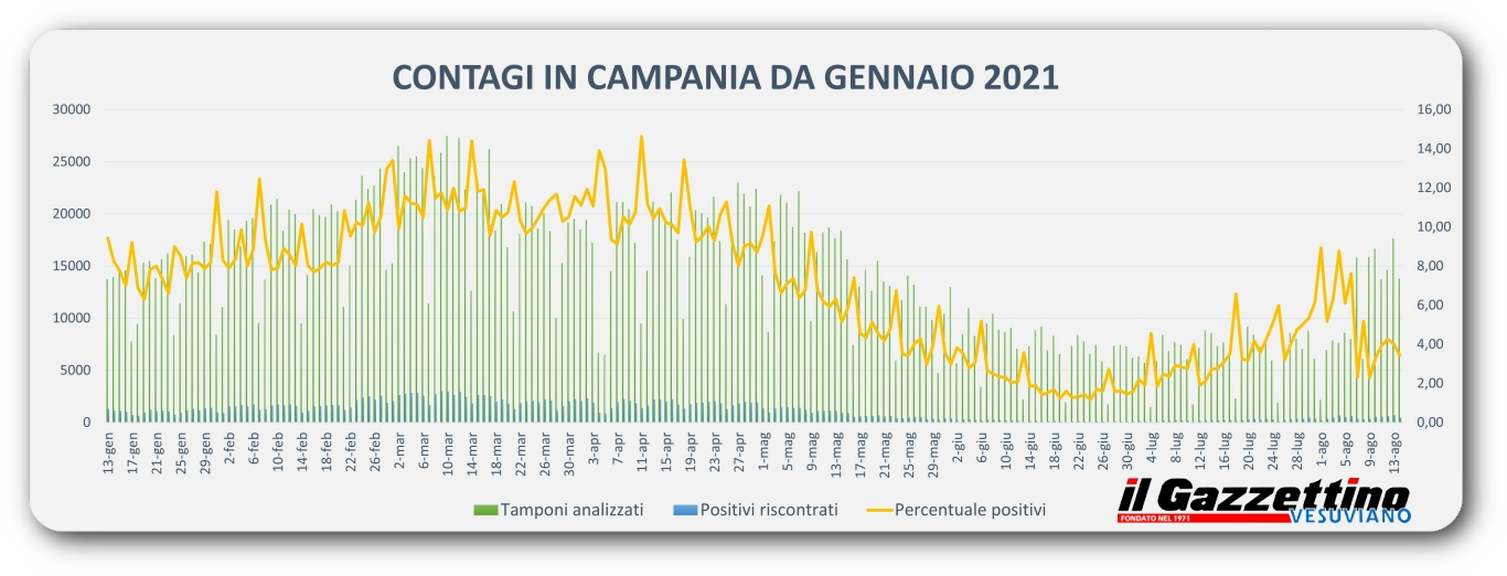 Giornata più che positiva quella registrata ieri e riportata in questo caldo Ferragosto per la Campania. Tutti i numeri in calo, sia per il contagio che per i ricoveri ospedalieri che dopo diversi giorni inverte l’andamento e infine per il tasso di positività che scende sotto il quattro per cento. Aumentano solo le persone attualmente positive e quelle in isolamento.