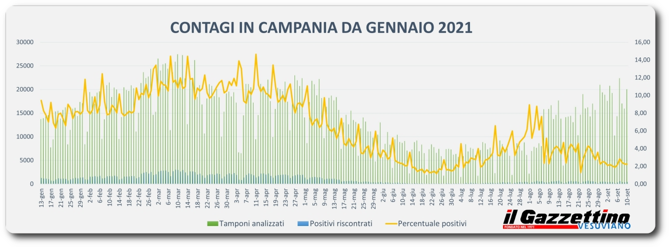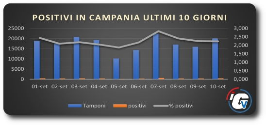 Continua a restare stabile il tasso di positività in Campania. Un numero maggiore di test processati e ovviamente più positivi riscontrati.