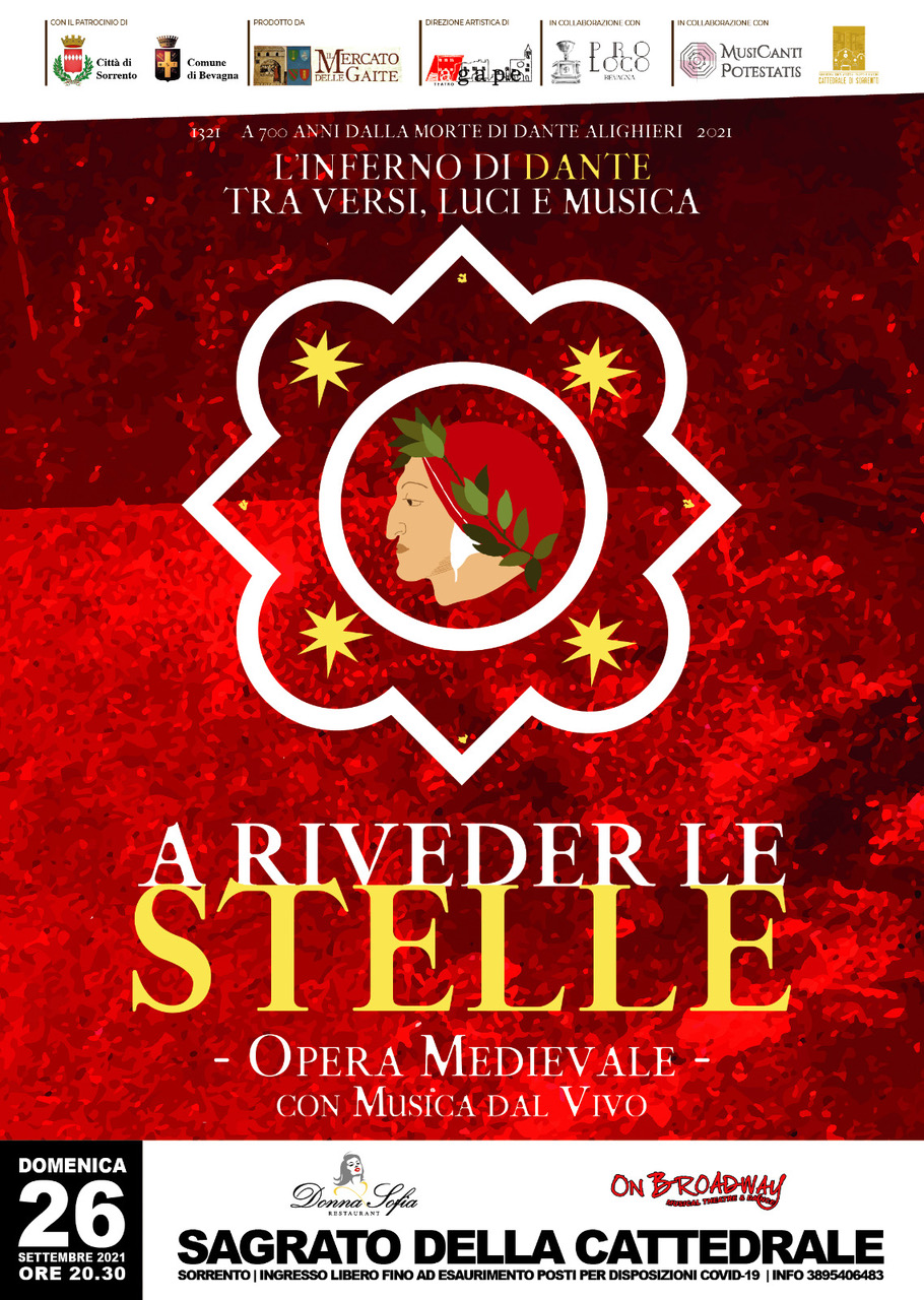 Un omaggio a Dante Alighieri a 700 anni dalla morte che Sorrento ha voluto tributare con una vera e propria opera medievale, scritta da Davide Gasparrini, musicata da Danilo Tamburo, con le coreografie di Veronica Taccucci. Un innovativo impianto scenico e sorprendenti effetti speciali incanteranno il pubblico: mostruose creature e paesaggi inattesi, demoni, giganti e illustri personaggi storici, crateri infuocati e speroni di roccia.