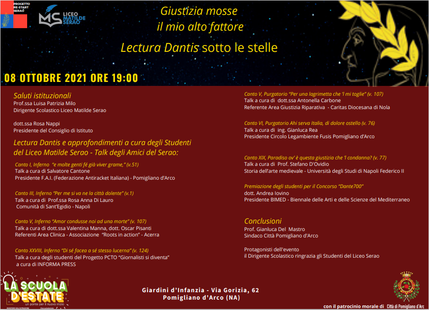 “Il SERAO WELCOME DAY culminerà infatti nell’evento serale “Giustizia mosse il mio Alto Fattore: Lectura Dantis sotto le stelle”, un momento per offrire il contributo della nostra scuola al settecentenario dantesco con produzioni e interventi degli studenti e di ospiti dal mondo dell’Università, dell’Associazionismo e della cultura, amici del nostro Istituto, su alcuni dei grandi temi universali e attuali che il capolavoro della Divina Commedia veicola e promuove anche nel nostro tessuto sociale e culturale”.