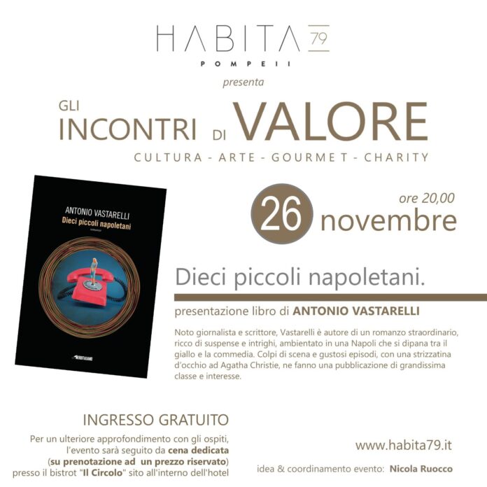Si terrà domani, 26 novembre (alle ore 20), all’Hotel Habita 79 Pompeii – MGallery (Via Roma, 10 – Pompei), la presentazione del libro “Dieci piccoli napoletani” di Antonio Vastarelli.