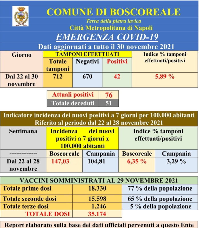 L’andamento del Covid-19 in città nel periodo dal 22 al 30 novembre, come si rileva dall’allegato report, all’esito del saldo tra guariti e nuovi positivi, ha fatto registrare un nuovo aumento degli attuali positivi passati a 76 (precedentemente erano 50), mentre è rimasto invariato il numero dei decessi, fermo a 51 dall’inizio della pandemia. In tale settimana sono stati effettuati complessivamente 712 tamponi, di cui 670 negativi e 42 positivi, con un indice tamponi effettuati/positivi del 5,89%.