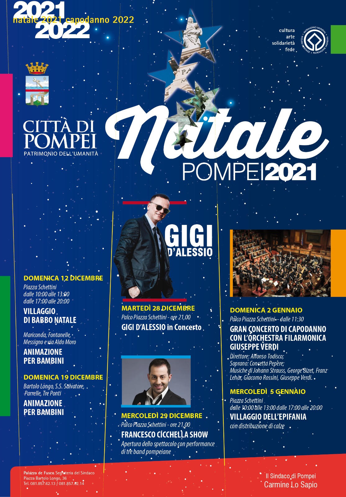 “Lo spirito di questo Natale è ridare gioia ed entusiasmo ai bambini – afferma il sindaco Lo Sapio – L’anno scorso hanno vissuto questa festività sottotono, sia in casa che per le strade. Pur mantenendo tutte le precauzioni del caso, quest’anno abbiamo deciso di invertire la tendenza e dare la possibilità ai bambini di rivivere la magia del Natale. La maggior parte degli eventi è dedicata proprio a loro. Per quanto riguarda i concerti, nonostante la normativa sia un po’ più tollerante essendo concerti all’aperto, abbiamo comunque deciso di mantenere i posti a sedere ed un numero limitato di spettatori. Per accedere all’area concerti di piazza Schettini sarà necessario essere in possesso del green Pass e prenotare attraverso le modalità che a breve verranno rese note attraverso i canali social ufficiali del Comune di Pompei”.