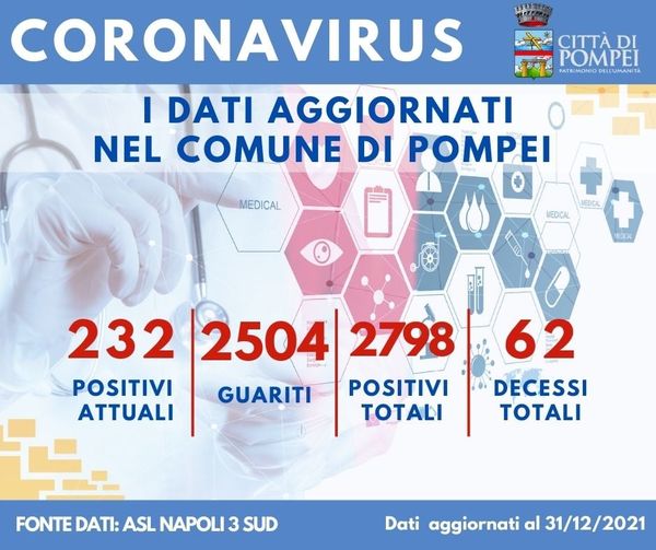 Un nuovo preoccupate bollettino Covid è stato pubblicato ieri sulla pagina social del Comune di Pompei. Nella giornata del 31 dicembre sono stati evidenziati 54 nuovi casi di positività. Dal bollettino precedente in data 29 dicembre, due giorni, il totale è di 80 nuovi positivi e 12 guariti.