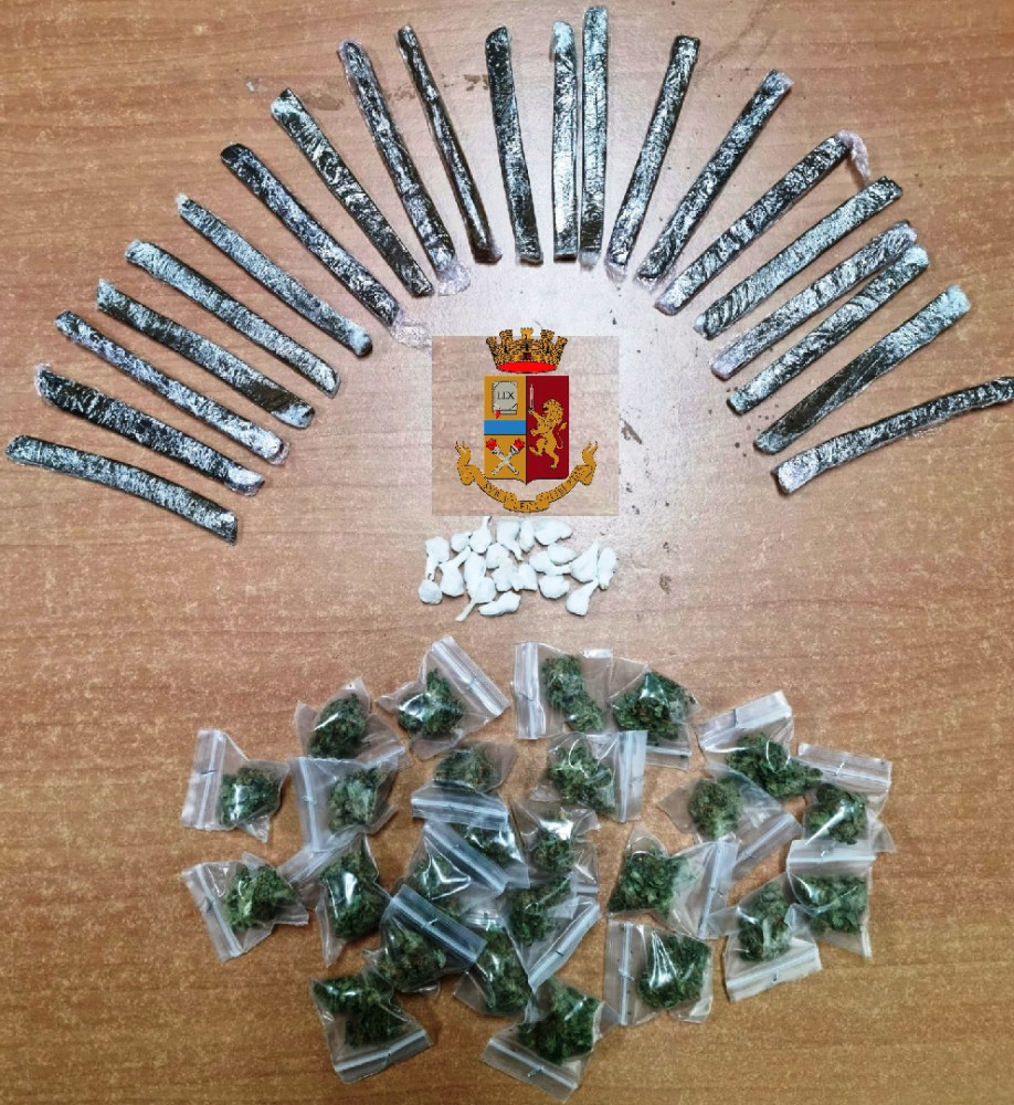 I poliziotti lo hanno fermato e trovato in possesso di 21 stecche di hashish del peso di circa 65 grammi, 20 involucri contenenti 5,5 grammi circa di cocaina e 25 bustine con 30 grammi circa di marijuana.