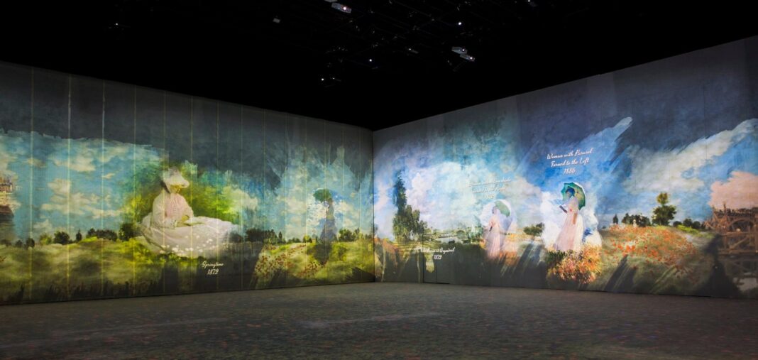 Il percorso multimediale si apre, agli occhi dello spettatore, attraverso il susseguirsi di corpose ma delicatissime pennellate proiettate a 360 gradi, su più di 1000 metri quadri di schermi; e più di 300 dipinti lo accompagnano nei luoghi che raccontano dei numerosi viaggi e del mondo del grande pittore francese.