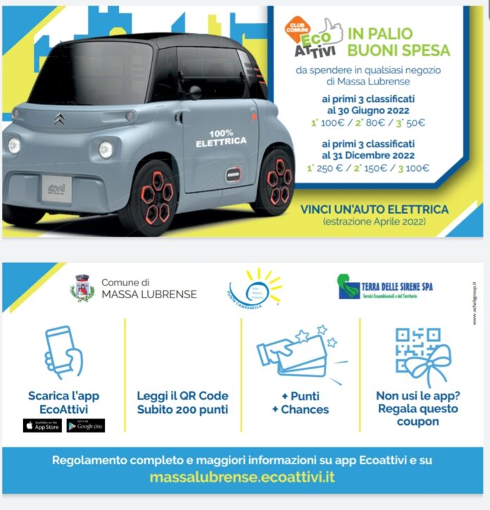 Ogni 100 punti un biglietto per partecipare al concorso nazionale, con l’auto elettrica in palio, e al concorso cittadino, che vedrà un totale di oltre 700 euro di buoni sconto spendibili presso gli esercizi commerciali di Massa Lubrense per i primi 3 classificati a giugno e dicembre. Un gioco stimolante e uno strumento di apprendimento dei temi ambientali con ripercussioni anche concrete per cittadini sempre più attenti alla sostenibilità nelle azioni quotidiane. Per partecipare basta scaricare gratuitamente l’App da qualsiasi smartphone, attraverso gli store Android e IOS o dal sito www.ecoattivi.it ed entrare nel club di Ecoattivi.